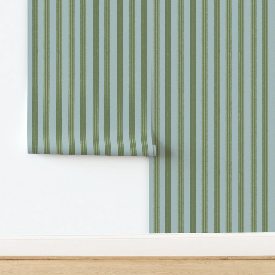 The green and blue striped wallpaper works beautifully as an accent wall behind the crib, creating a focal point in the room. Alternatively, consider wallpapering an entire room for a bolder look that envelops the space in warmth. Using this pretty stripe above a chair rail would give the illusion of height.