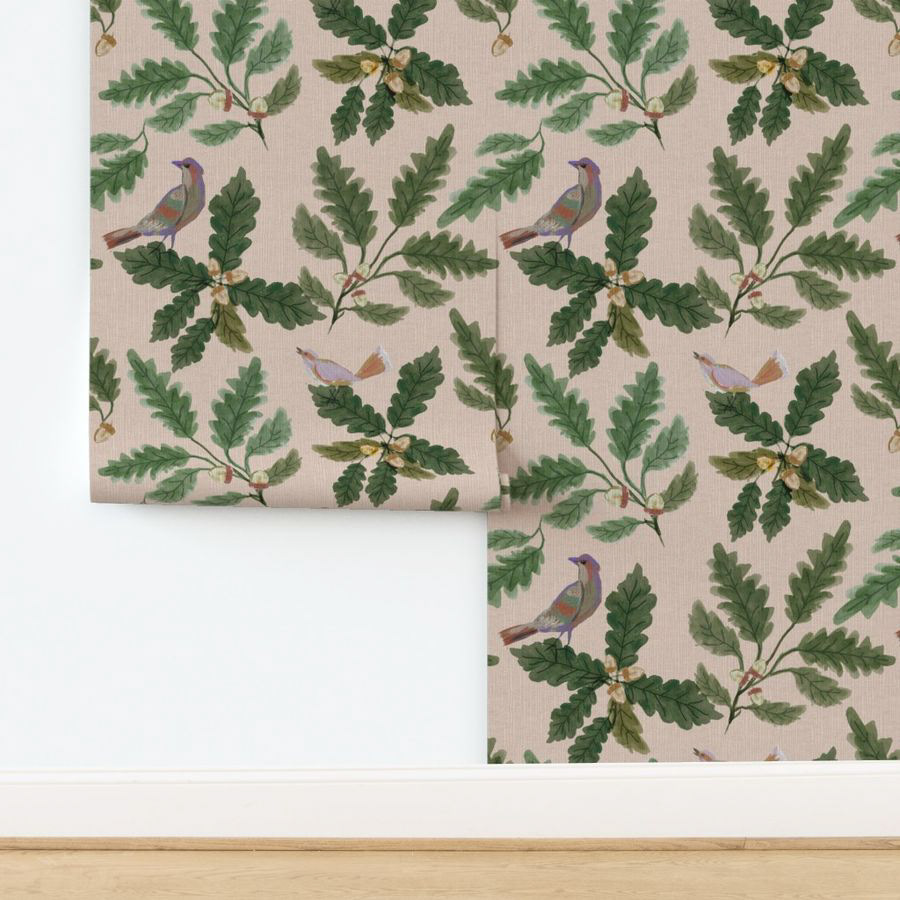 This pretty, nature inspired, pattern began by hand painted each leaf and bird in my home studio. Arranging the motifs in a flowing tossed motion this leafy oak tree design emerged. The soft blush pink background is a favorite color of mine and its muted hue goes perfectly with sage greens and creams.